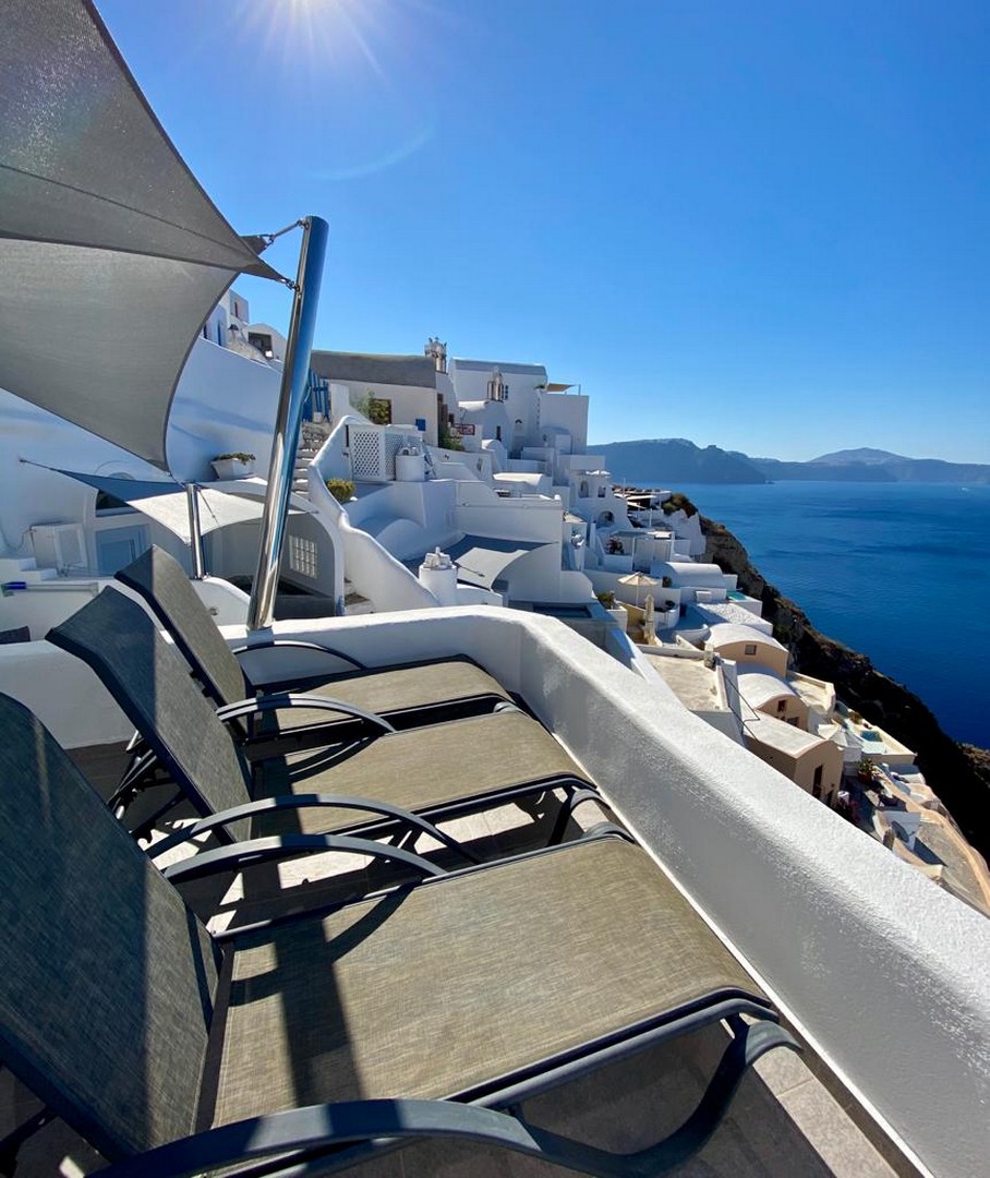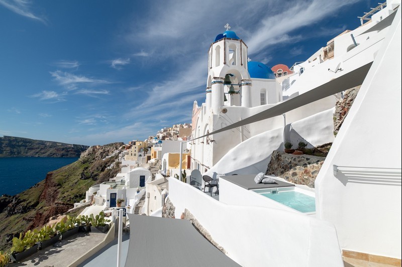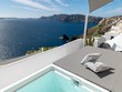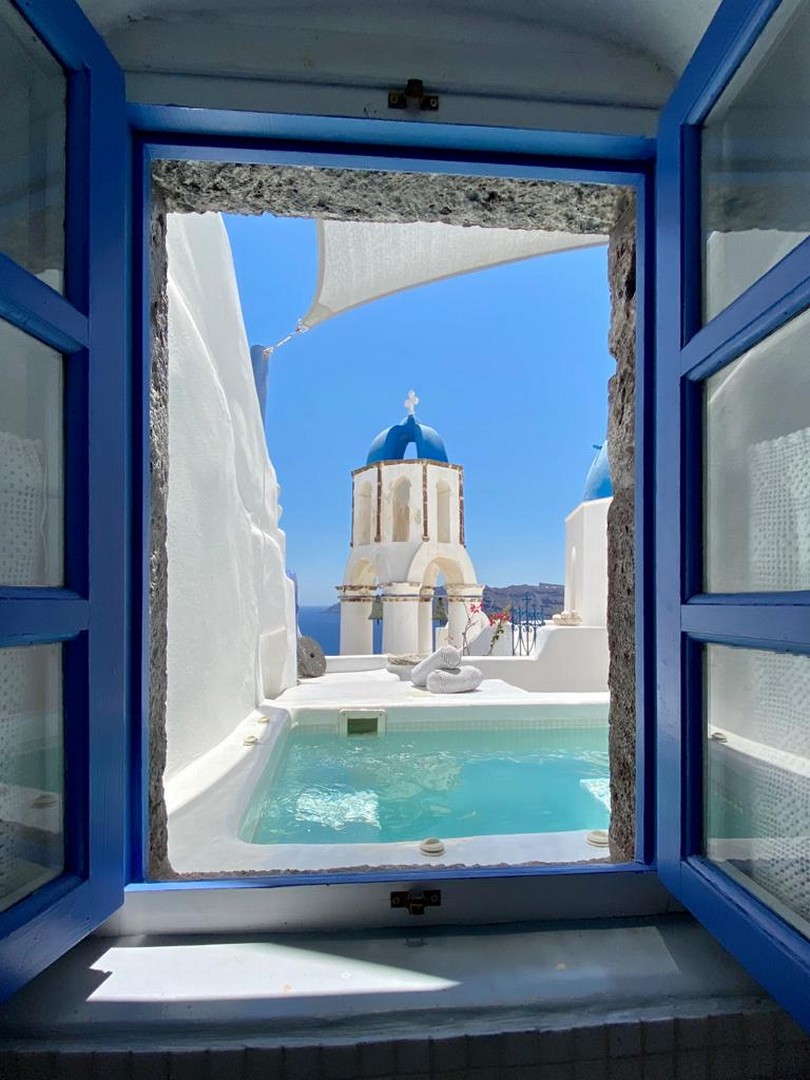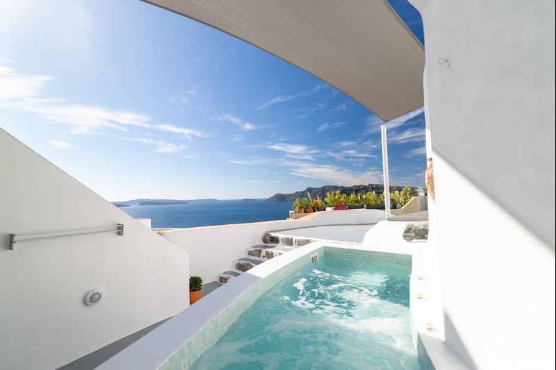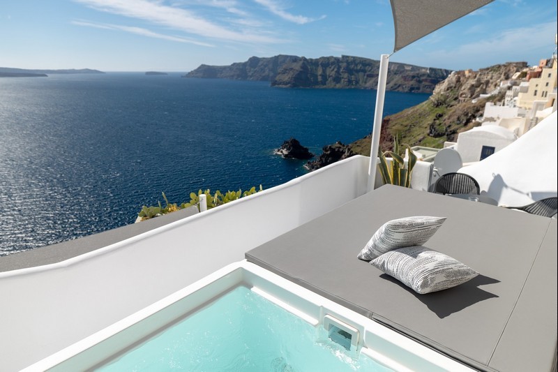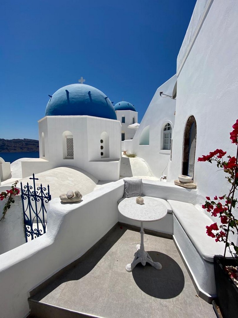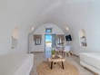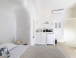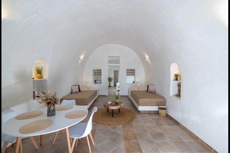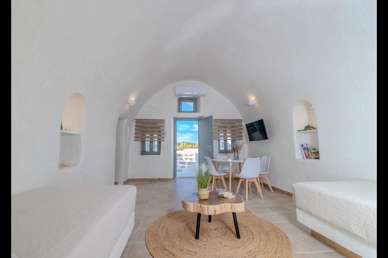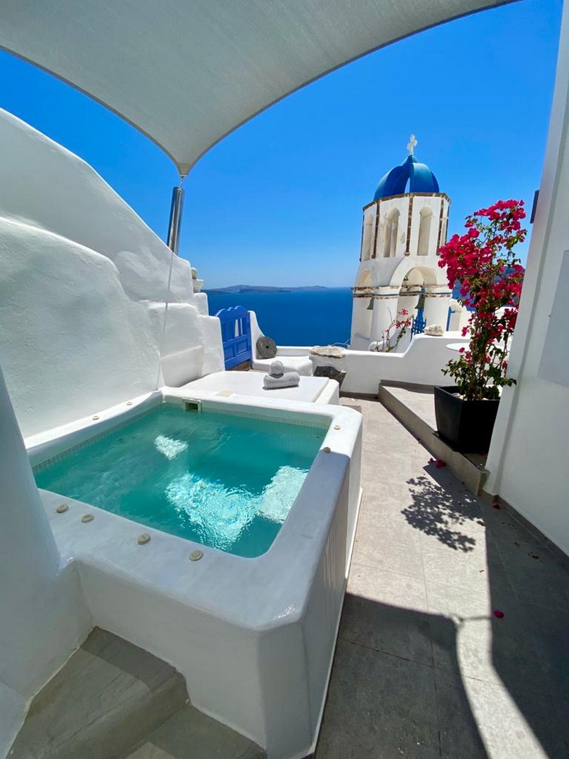 Santo Blue Horizon villa is found in the heart of Oia, at an exceptional location and has an amazing view. The three church domes exactly in front of the villa with the panoramic view have enchanted visitors and photographers from around the world, making it one of the most famous spots of Santorini. The property is in complete harmony with the natural environment of the area, and follows the rules of traditional Cycladic architecture. The villa is made up of two units. One is a traditional house-cave and one a studio, which combined can accommodate up to 7 people. The traditional house is 80sq.m., can accommodate 4 persons and has a private entrance, a big outdoor Jacuzzi for up to 4 persons, a spacious living room, a fully equipped kitchen and 2 bedrooms with a double bed and ensuite bathroom in each. The first bedroom has a large ensuite bathroom with Jacuzzi-hydromassage, while the second bedroom has an ensuite bathroom with shower. The "hot spot" of the traditional cave-house is a tunnel which leads to the upper level where there is a balcony and veranda with a magical view of the Aegean Sea, the Caldera, and is ideal for dinner and relaxation. The second unit of the Santo Blue Horizon villa, is a studio of 25sq.m., which has its own private entrance. It can accommodation up to 3 persons and features a bathroom with shower, a large double bed in a wooden loft and a spacious living room with a single bed. Both units are beautifully decorated and fully equipped. The traditional house-cave and the studio are only available for joint rental, not separately.
