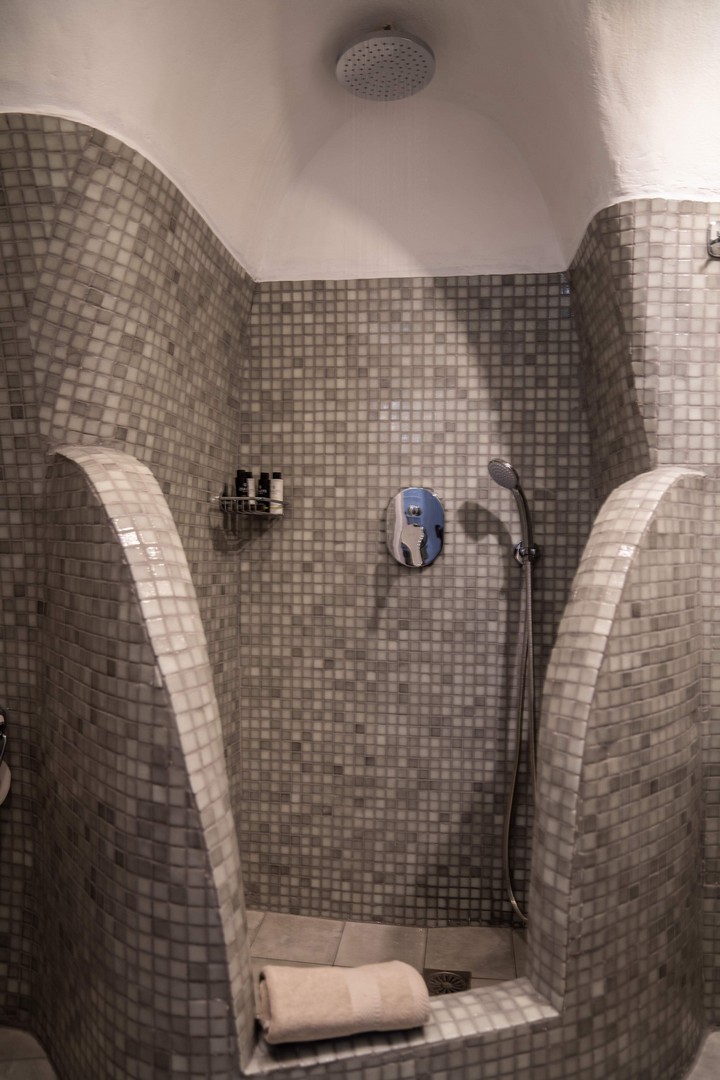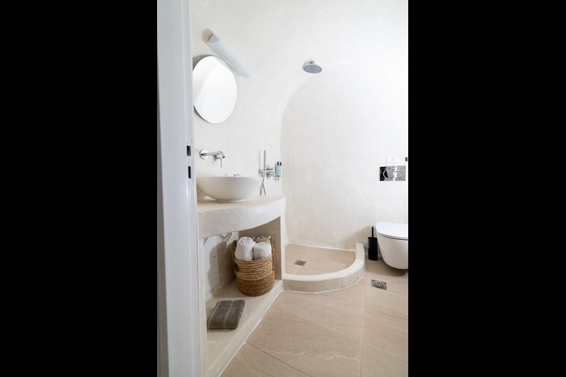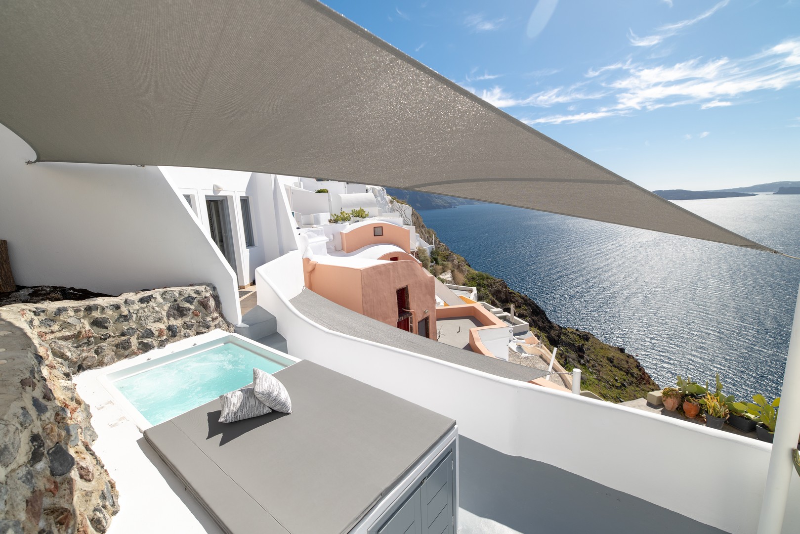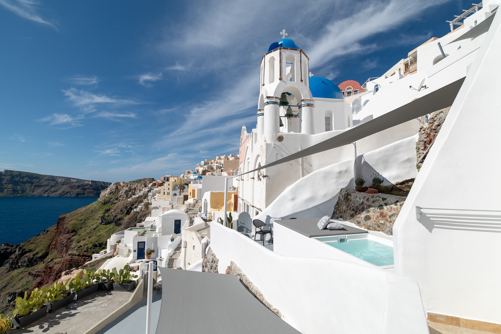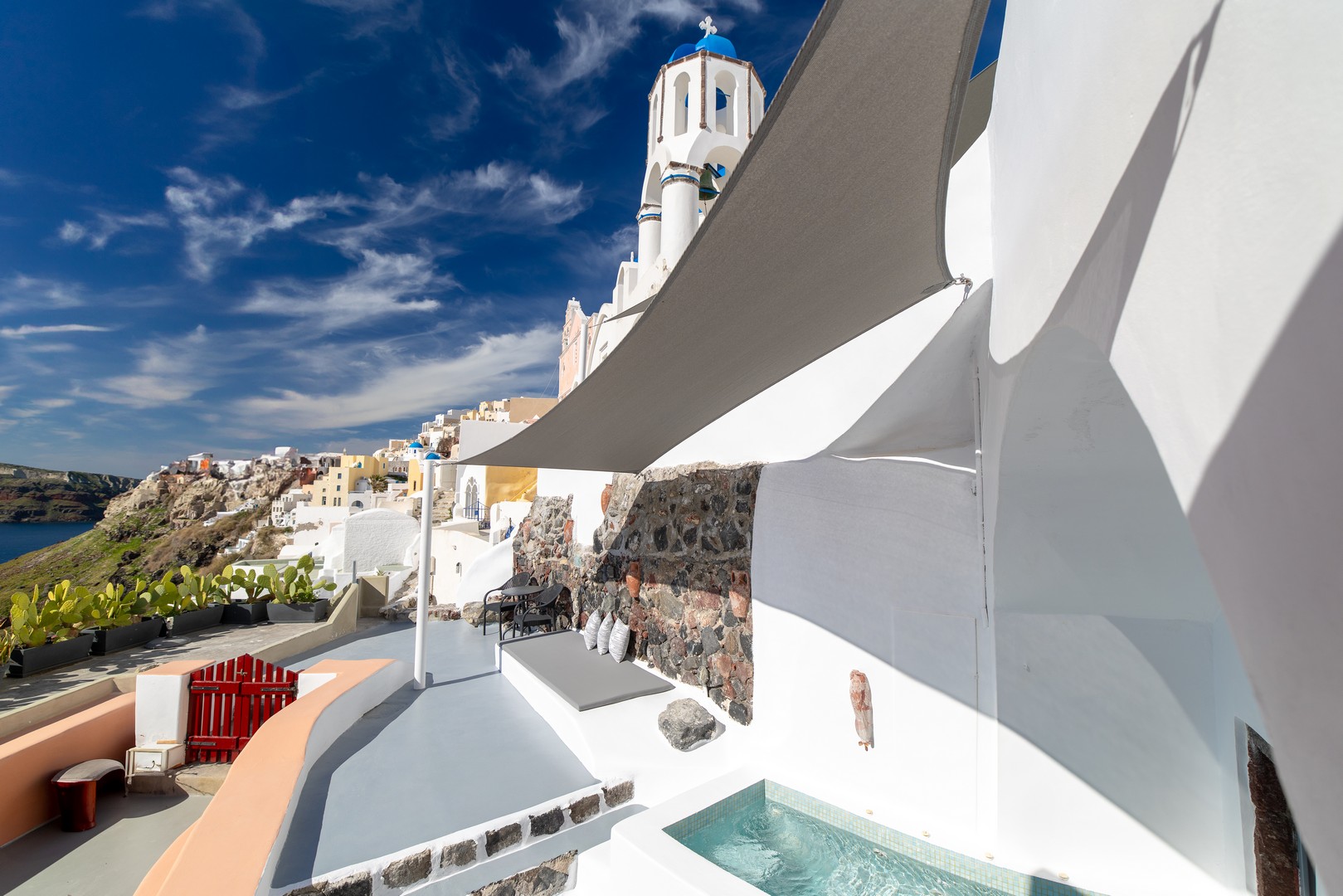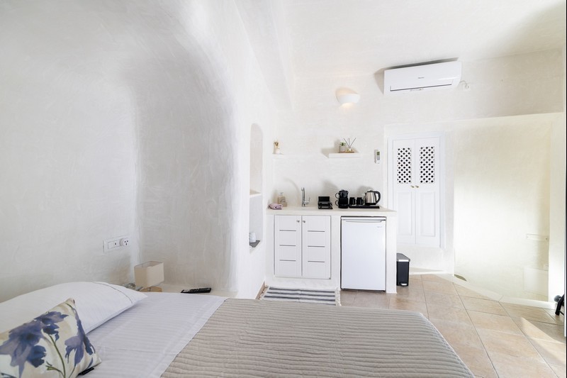 Santo Blue Horizon villa is found in the heart of Oia, at an exceptional location and has an amazing view. The three church domes exactly in front of the villa with the panoramic view have enchanted visitors and photographers from around the world, making it one of the most famous spots of Santorini. The property is in complete harmony with the natural environment of the area, and follows the rules of traditional Cycladic architecture. The villa is made up of two units. One is a traditional house-cave and one a studio, which combined can accommodate up to 7 people. The traditional house is 80sq.m., can accommodate 4 persons and has a private entrance, a big outdoor Jacuzzi for up to 4 persons, a spacious living room, a fully equipped kitchen and 2 bedrooms with a double bed and ensuite bathroom in each. The first bedroom has a large ensuite bathroom with Jacuzzi-hydromassage, while the second bedroom has an ensuite bathroom with shower. The "hot spot" of the traditional cave-house is a tunnel which leads to the upper level where there is a balcony and veranda with a magical view of the Aegean Sea, the Caldera, and is ideal for dinner and relaxation. The second unit of the Santo Blue Horizon villa, is a studio of 25sq.m., which has its own private entrance. It can accommodation up to 3 persons and features a bathroom with shower, a large double bed in a wooden loft and a spacious living room with a single bed. Both units are beautifully decorated and fully equipped. The traditional house-cave and the studio are only available for joint rental, not separately.