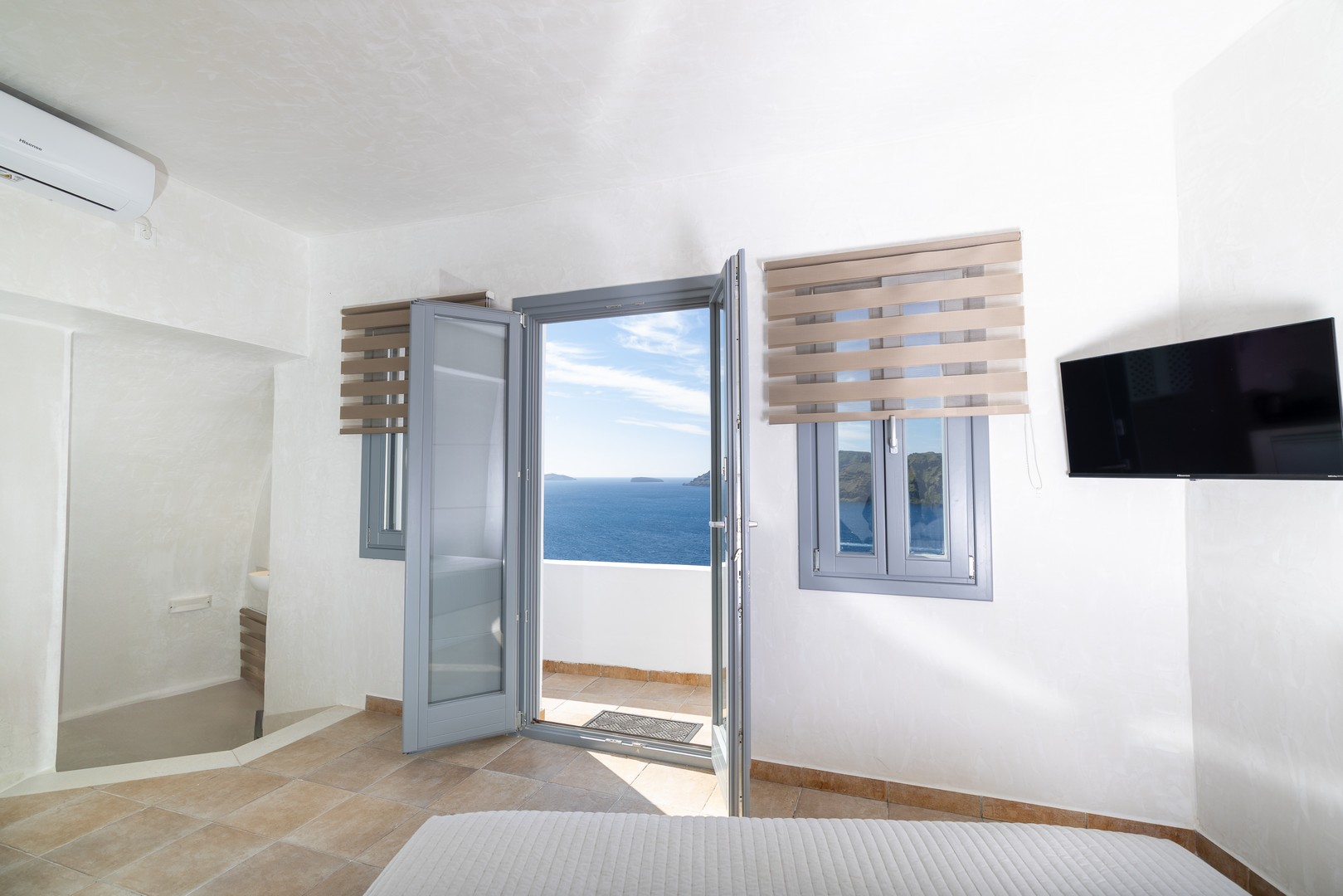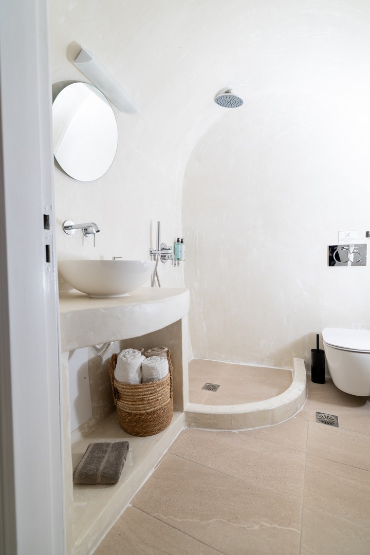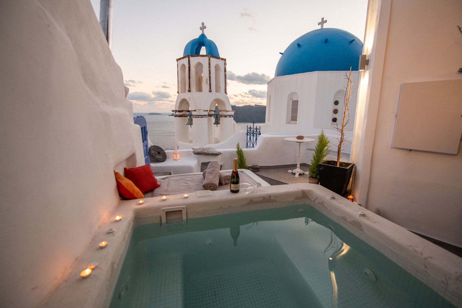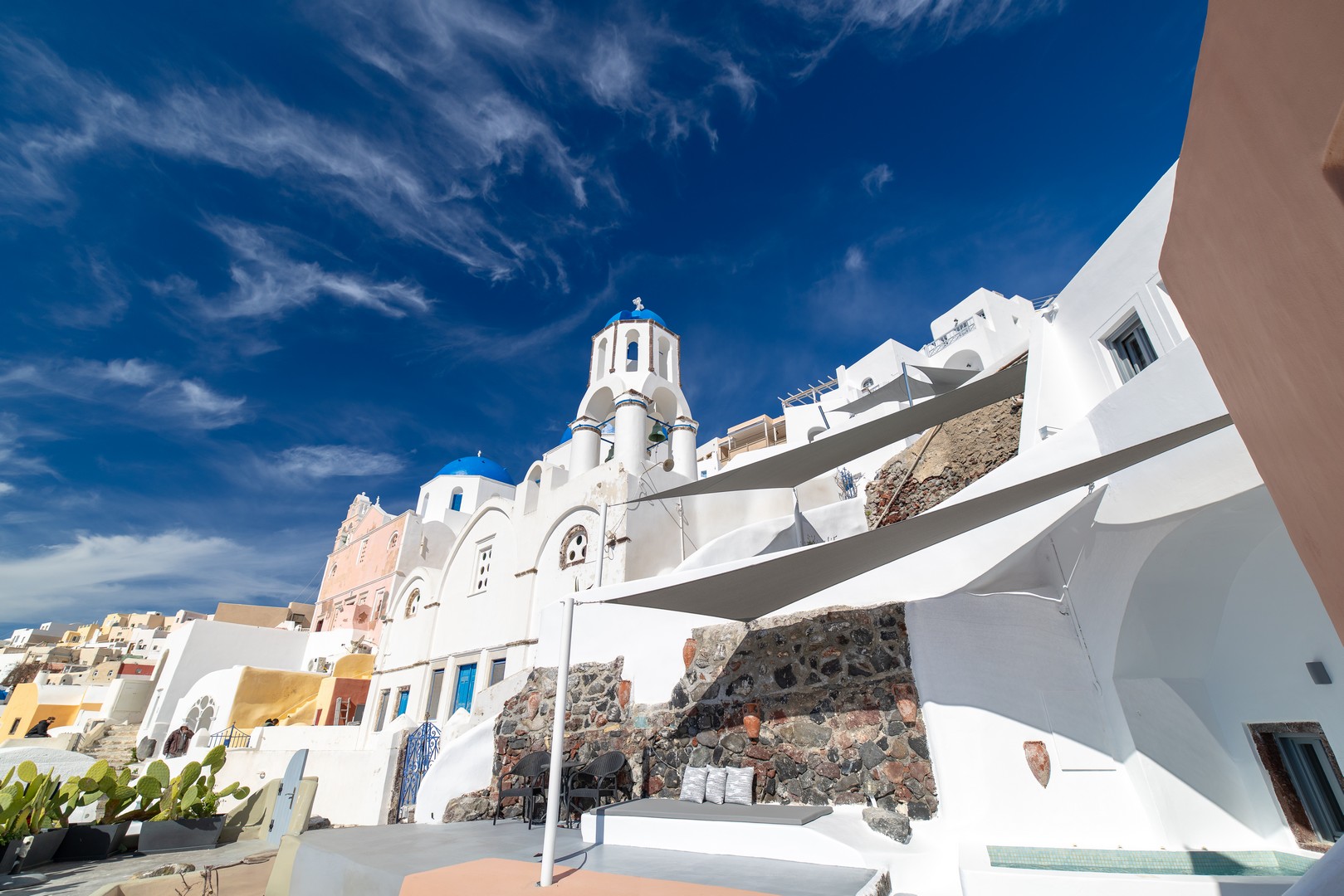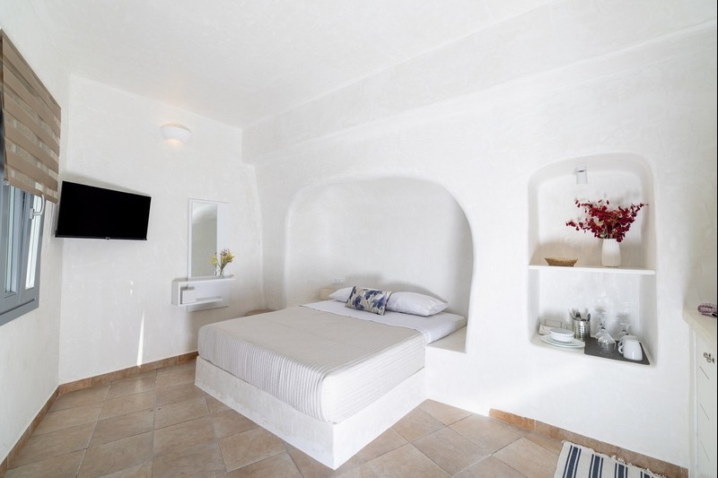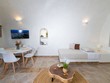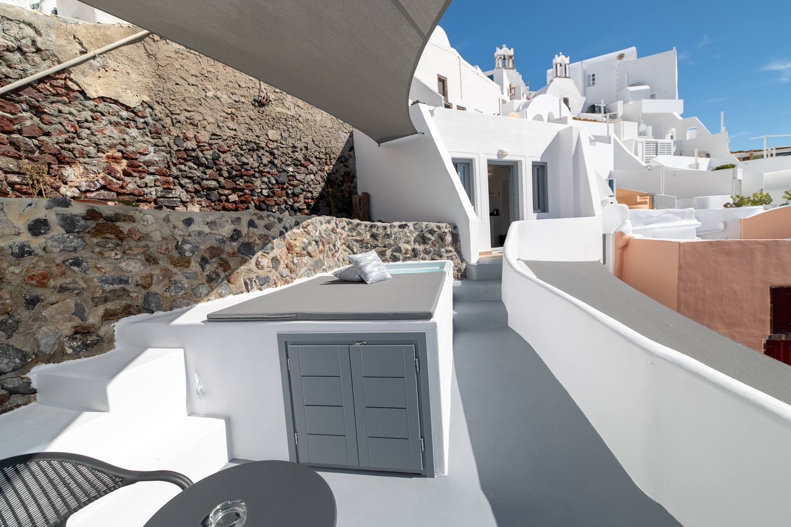 Santo Blue Horizon villa is found in the heart of Oia, at an exceptional location and has an amazing view. The three church domes exactly in front of the villa with the panoramic view have enchanted visitors and photographers from around the world, making it one of the most famous spots of Santorini. The property is in complete harmony with the natural environment of the area, and follows the rules of traditional Cycladic architecture. The villa is made up of two units. One is a traditional house-cave and one a studio, which combined can accommodate up to 7 people. The traditional house is 80sq.m., can accommodate 4 persons and has a private entrance, a big outdoor Jacuzzi for up to 4 persons, a spacious living room, a fully equipped kitchen and 2 bedrooms with a double bed and ensuite bathroom in each. The first bedroom has a large ensuite bathroom with Jacuzzi-hydromassage, while the second bedroom has an ensuite bathroom with shower. The "hot spot" of the traditional cave-house is a tunnel which leads to the upper level where there is a balcony and veranda with a magical view of the Aegean Sea, the Caldera, and is ideal for dinner and relaxation. The second unit of the Santo Blue Horizon villa, is a studio of 25sq.m., which has its own private entrance. It can accommodation up to 3 persons and features a bathroom with shower, a large double bed in a wooden loft and a spacious living room with a single bed. Both units are beautifully decorated and fully equipped. The traditional house-cave and the studio are only available for joint rental, not separately.