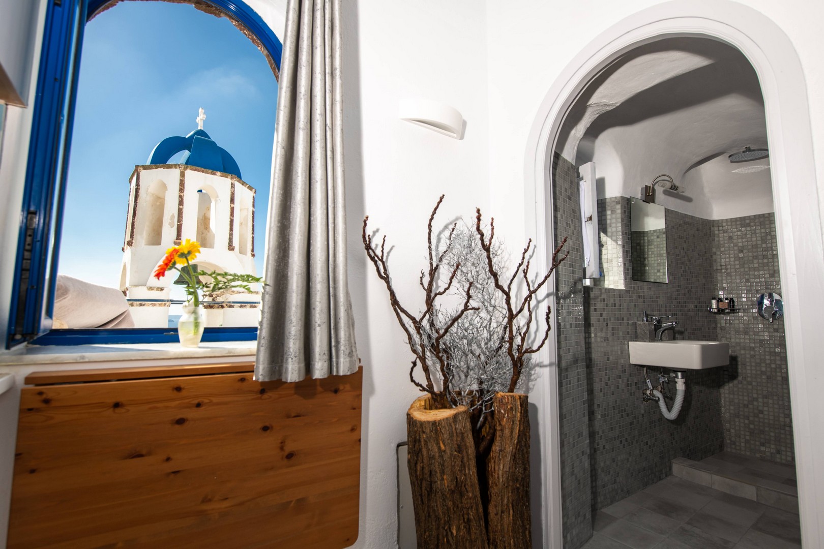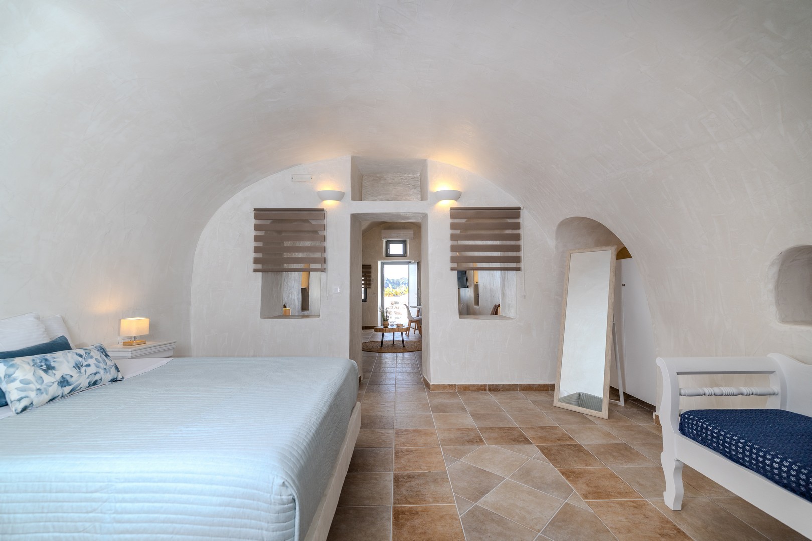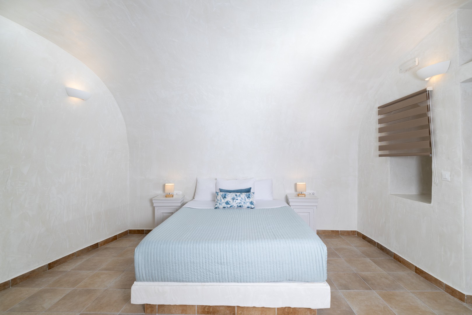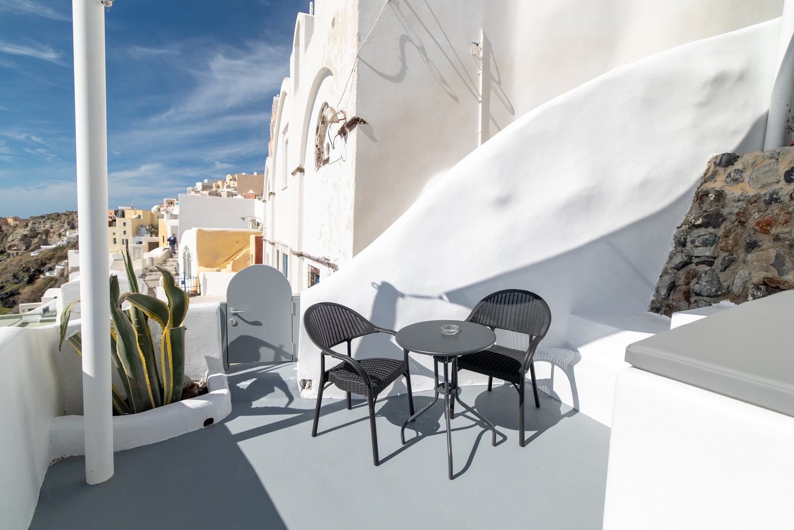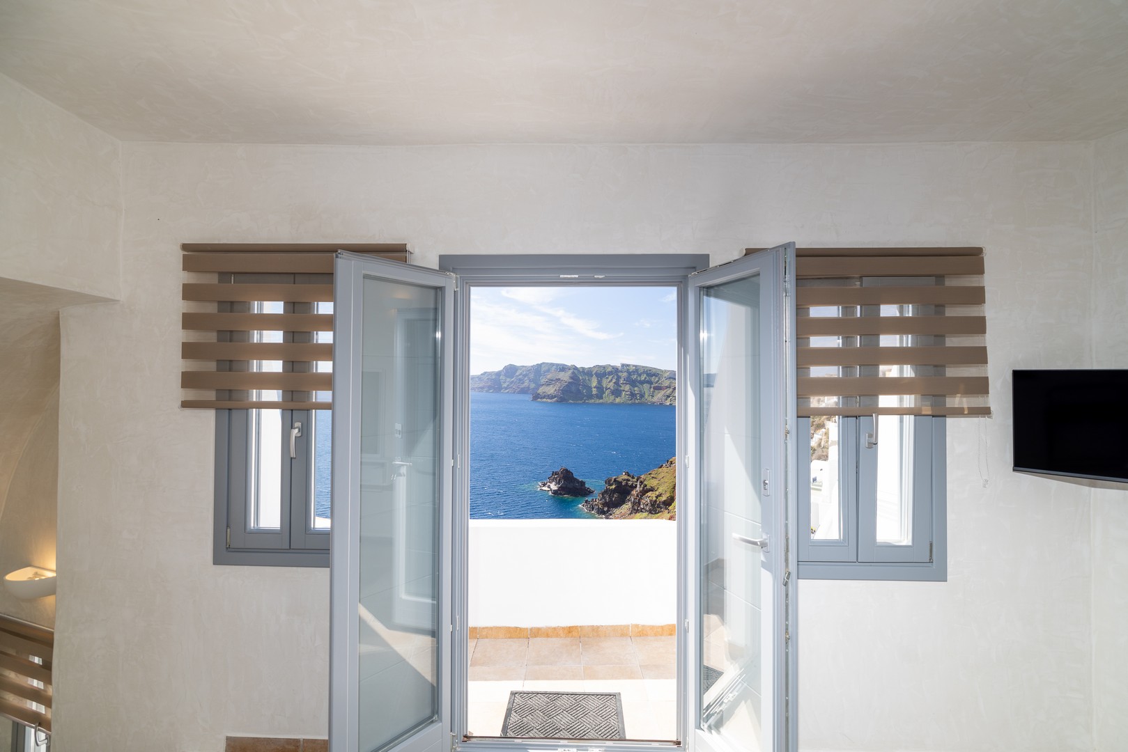 Santo Blue Horizon villa is found in the heart of Oia, at an exceptional location and has an amazing view. The three church domes exactly in front of the villa with the panoramic view have enchanted visitors and photographers from around the world, making it one of the most famous spots of Santorini. The property is in complete harmony with the natural environment of the area, and follows the rules of traditional Cycladic architecture. The villa is made up of two units. One is a traditional house-cave and one a studio, which combined can accommodate up to 7 people. The traditional house is 80sq.m., can accommodate 4 persons and has a private entrance, a big outdoor Jacuzzi for up to 4 persons, a spacious living room, a fully equipped kitchen and 2 bedrooms with a double bed and ensuite bathroom in each. The first bedroom has a large ensuite bathroom with Jacuzzi-hydromassage, while the second bedroom has an ensuite bathroom with shower. The "hot spot" of the traditional cave-house is a tunnel which leads to the upper level where there is a balcony and veranda with a magical view of the Aegean Sea, the Caldera, and is ideal for dinner and relaxation. The second unit of the Santo Blue Horizon villa, is a studio of 25sq.m., which has its own private entrance. It can accommodation up to 3 persons and features a bathroom with shower, a large double bed in a wooden loft and a spacious living room with a single bed. Both units are beautifully decorated and fully equipped. The traditional house-cave and the studio are only available for joint rental, not separately.