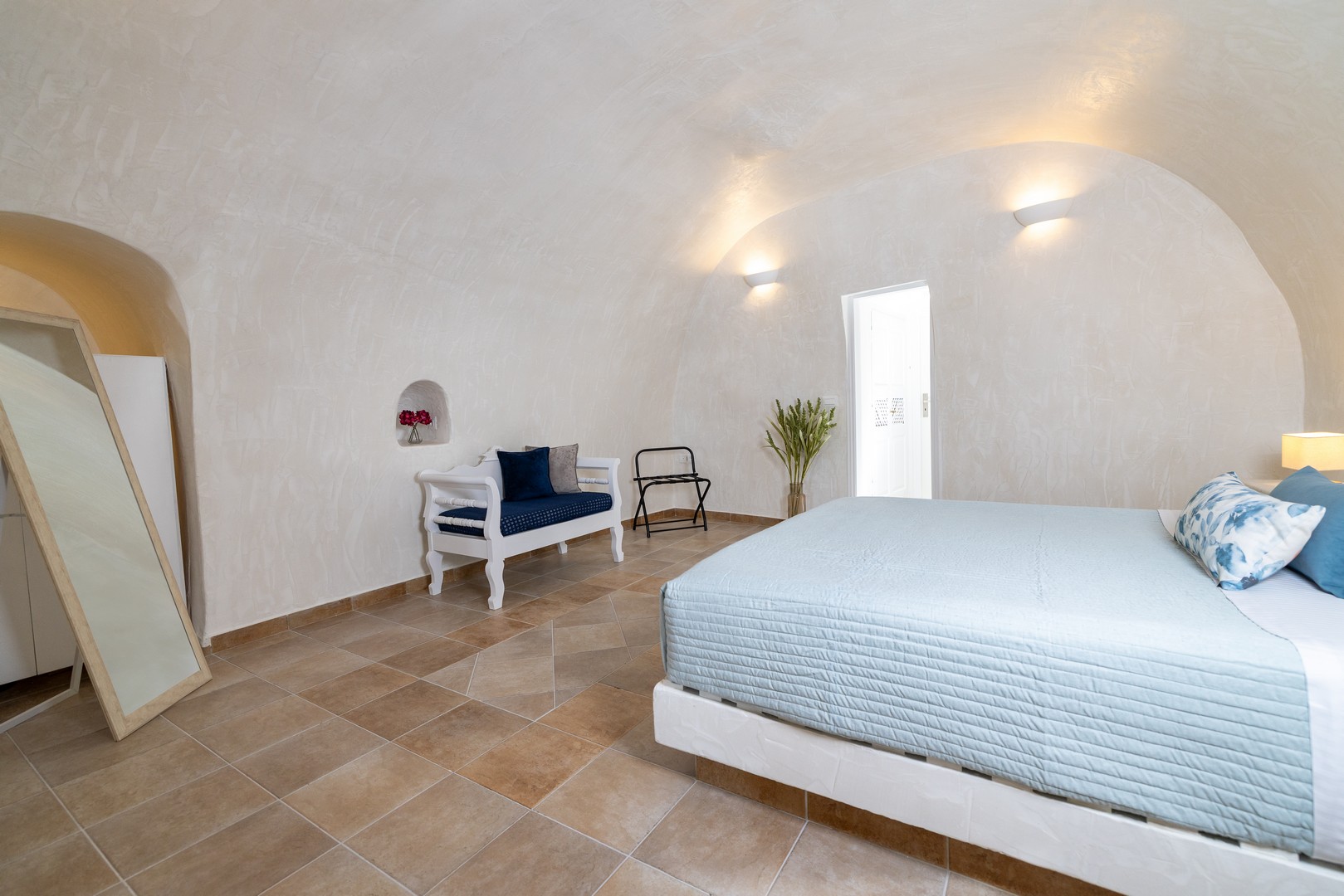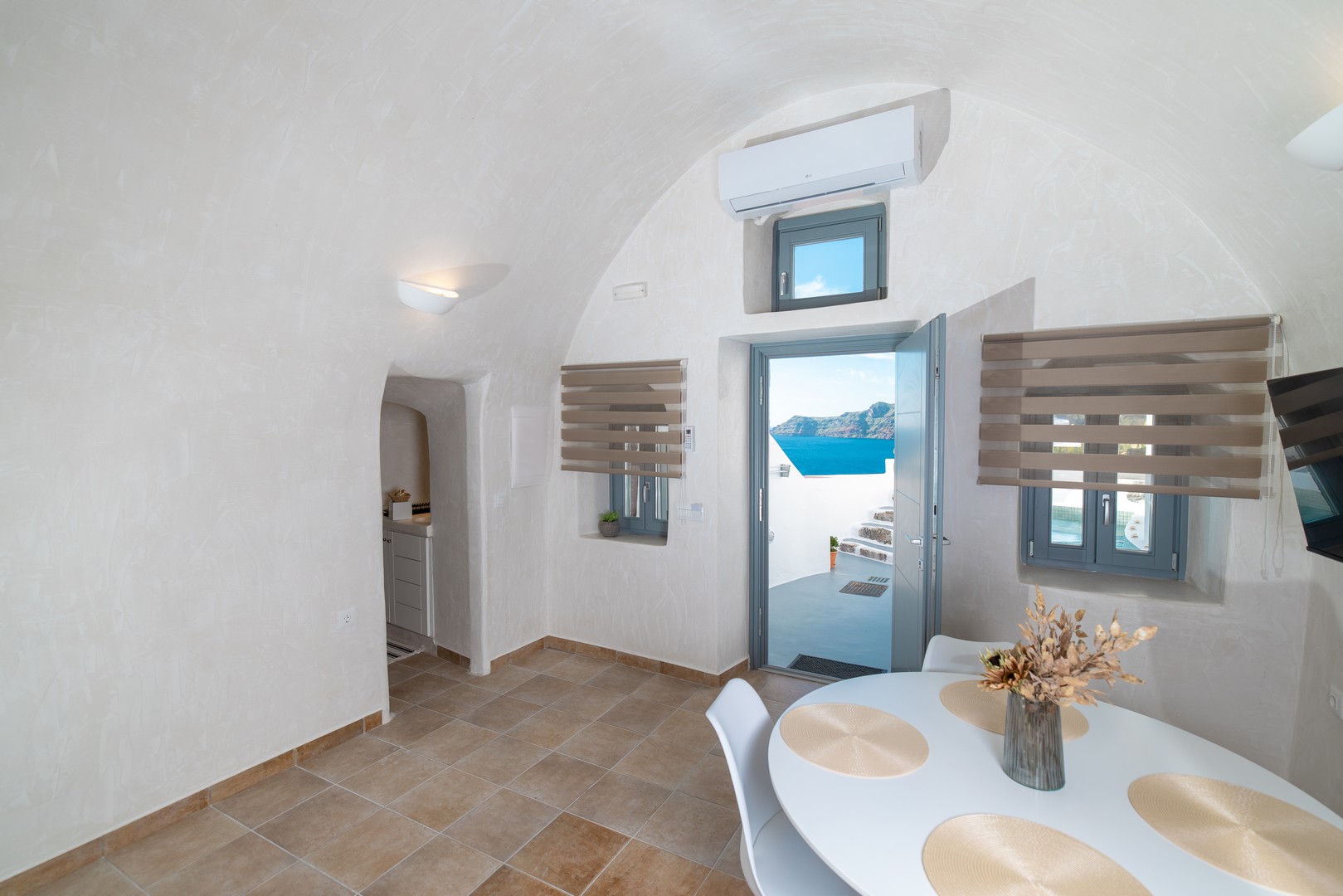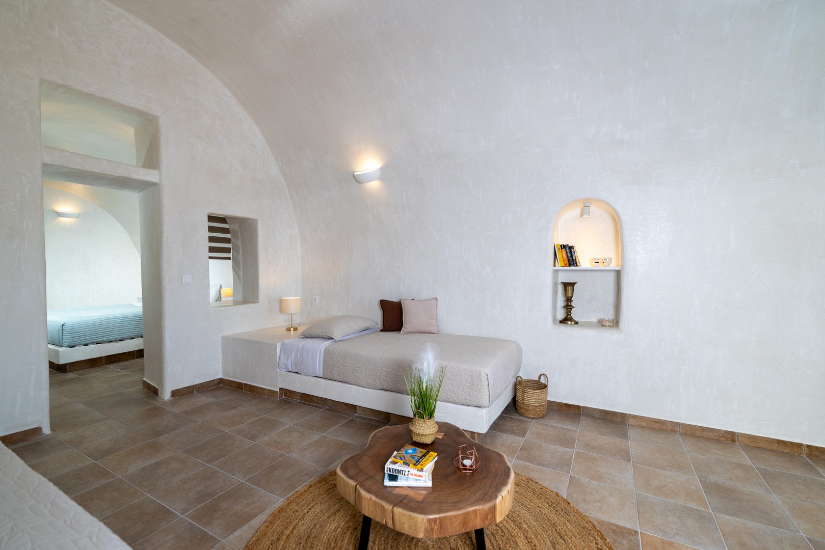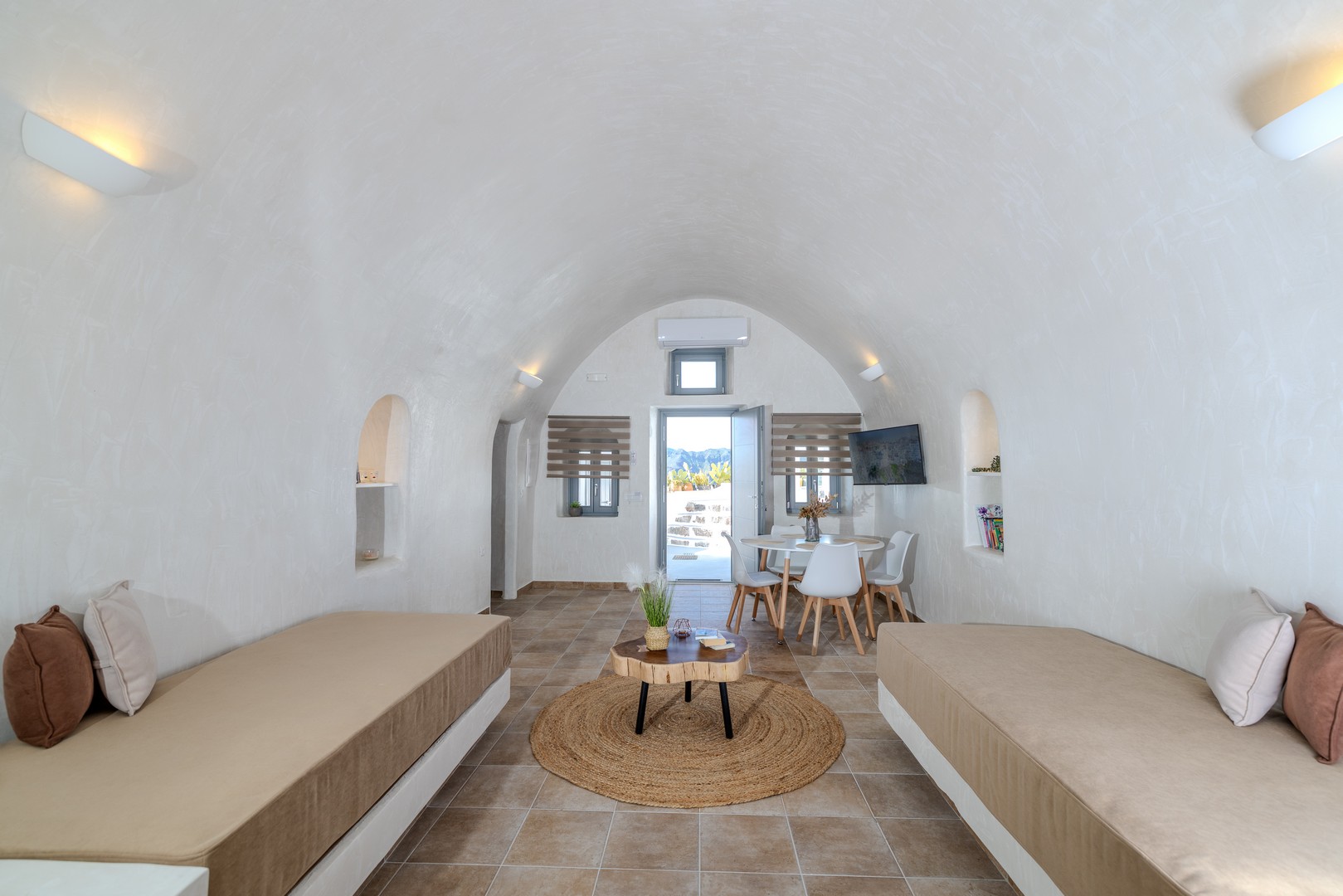 Santo Blue Horizon villa is found in the heart of Oia, at an exceptional location and has an amazing view. The three church domes exactly in front of the villa with the panoramic view have enchanted visitors and photographers from around the world, making it one of the most famous spots of Santorini. The property is in complete harmony with the natural environment of the area, and follows the rules of traditional Cycladic architecture. The villa is made up of two units. One is a traditional house-cave and one a studio, which combined can accommodate up to 7 people. The traditional house is 80sq.m., can accommodate 4 persons and has a private entrance, a big outdoor Jacuzzi for up to 4 persons, a spacious living room, a fully equipped kitchen and 2 bedrooms with a double bed and ensuite bathroom in each. The first bedroom has a large ensuite bathroom with Jacuzzi-hydromassage, while the second bedroom has an ensuite bathroom with shower. The "hot spot" of the traditional cave-house is a tunnel which leads to the upper level where there is a balcony and veranda with a magical view of the Aegean Sea, the Caldera, and is ideal for dinner and relaxation. The second unit of the Santo Blue Horizon villa, is a studio of 25sq.m., which has its own private entrance. It can accommodation up to 3 persons and features a bathroom with shower, a large double bed in a wooden loft and a spacious living room with a single bed. Both units are beautifully decorated and fully equipped. The traditional house-cave and the studio are only available for joint rental, not separately.