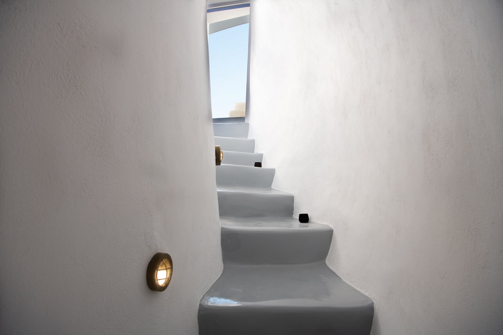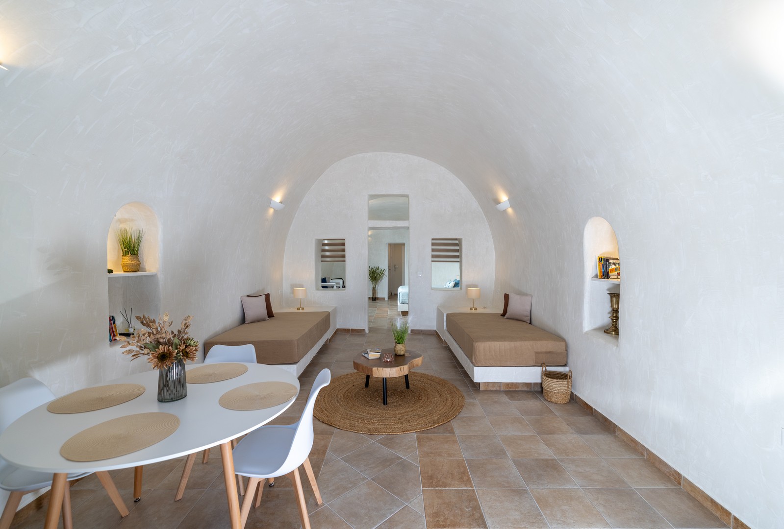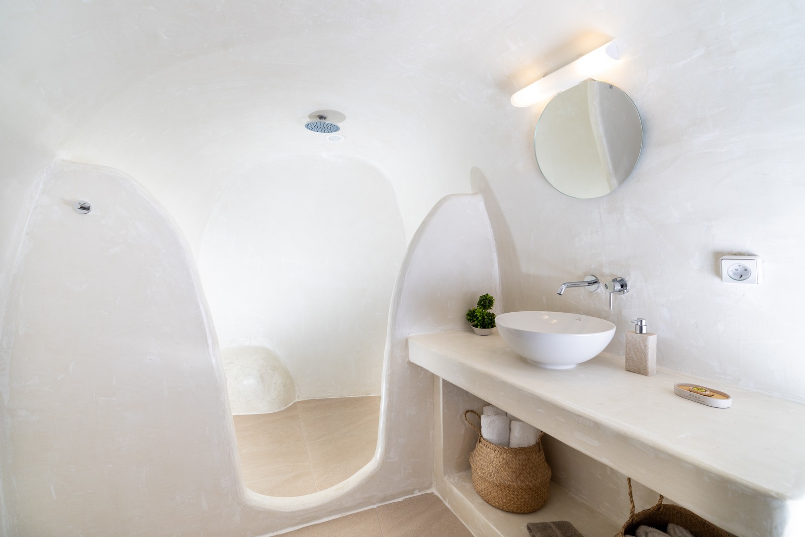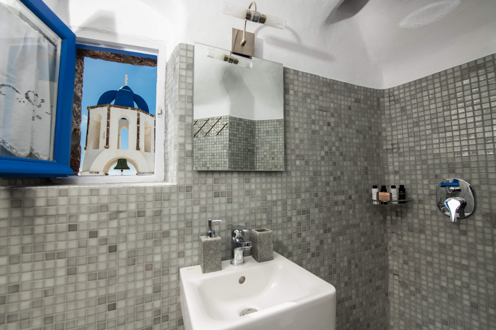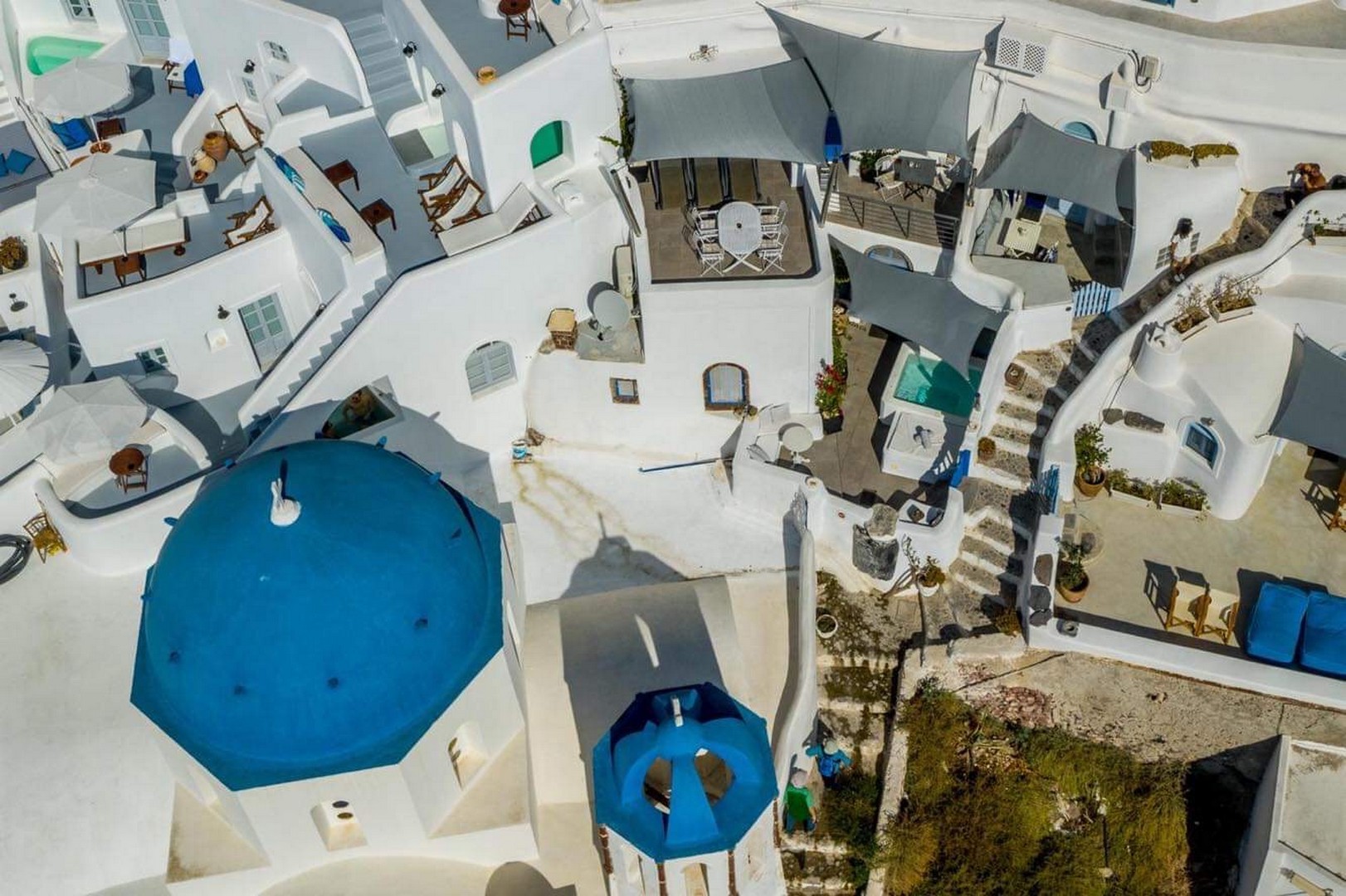 Santo Blue Horizon villa is found in the heart of Oia, at an exceptional location and has an amazing view. The three church domes exactly in front of the villa with the panoramic view have enchanted visitors and photographers from around the world, making it one of the most famous spots of Santorini. The property is in complete harmony with the natural environment of the area, and follows the rules of traditional Cycladic architecture. The villa is made up of two units. One is a traditional house-cave and one a studio, which combined can accommodate up to 7 people. The traditional house is 80sq.m., can accommodate 4 persons and has a private entrance, a big outdoor Jacuzzi for up to 4 persons, a spacious living room, a fully equipped kitchen and 2 bedrooms with a double bed and ensuite bathroom in each. The first bedroom has a large ensuite bathroom with Jacuzzi-hydromassage, while the second bedroom has an ensuite bathroom with shower. The "hot spot" of the traditional cave-house is a tunnel which leads to the upper level where there is a balcony and veranda with a magical view of the Aegean Sea, the Caldera, and is ideal for dinner and relaxation. The second unit of the Santo Blue Horizon villa, is a studio of 25sq.m., which has its own private entrance. It can accommodation up to 3 persons and features a bathroom with shower, a large double bed in a wooden loft and a spacious living room with a single bed. Both units are beautifully decorated and fully equipped. The traditional house-cave and the studio are only available for joint rental, not separately.