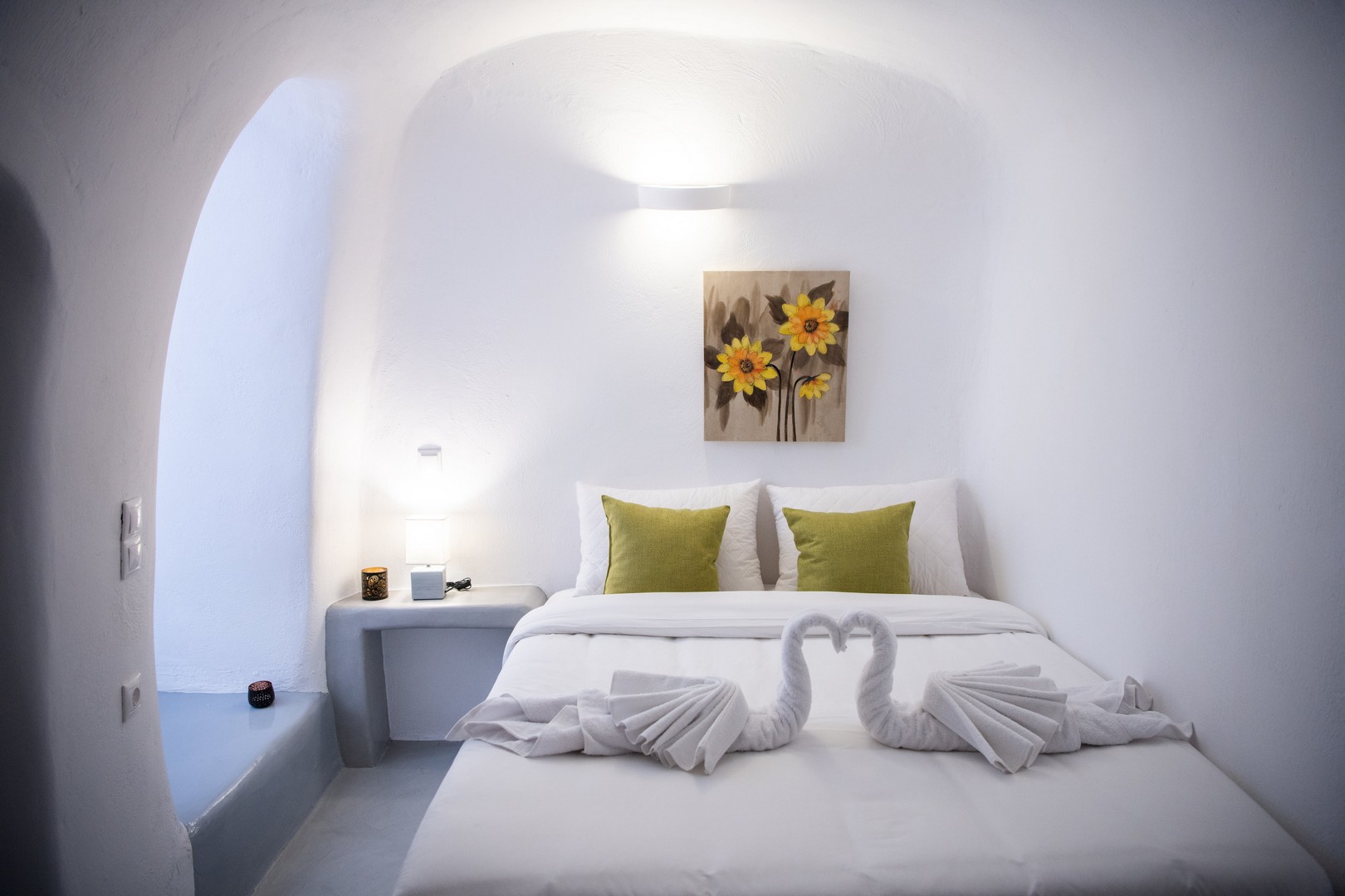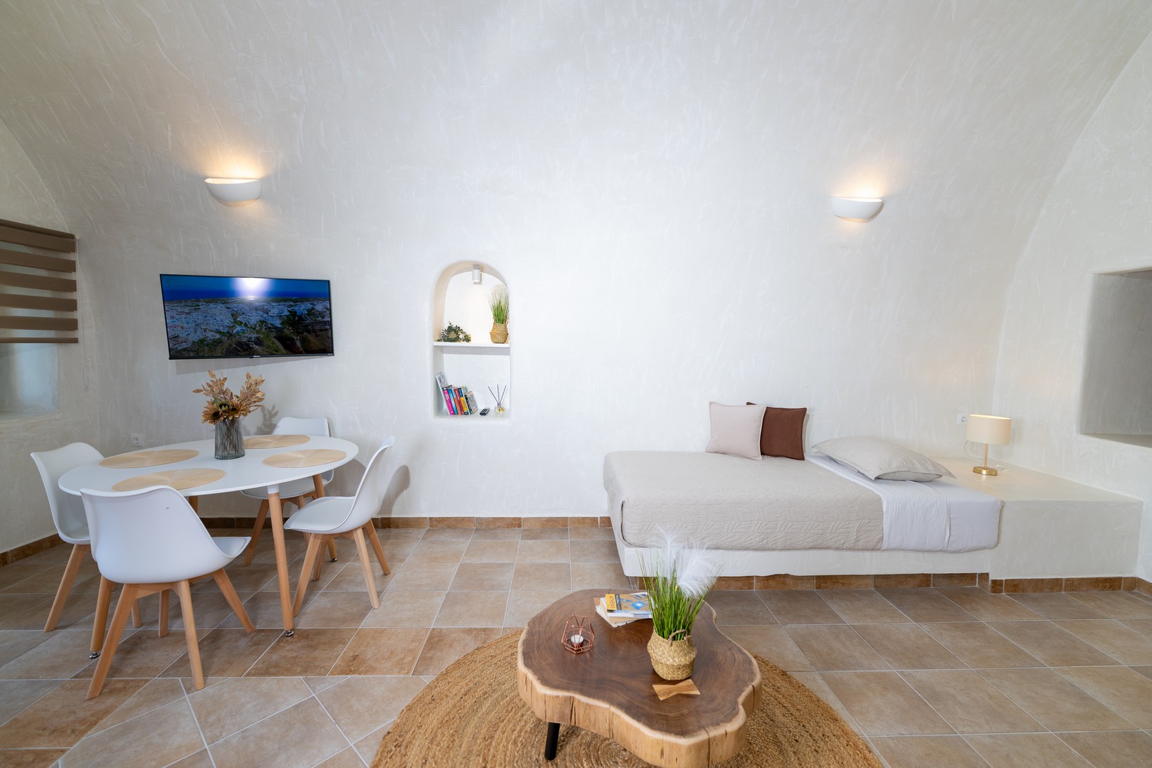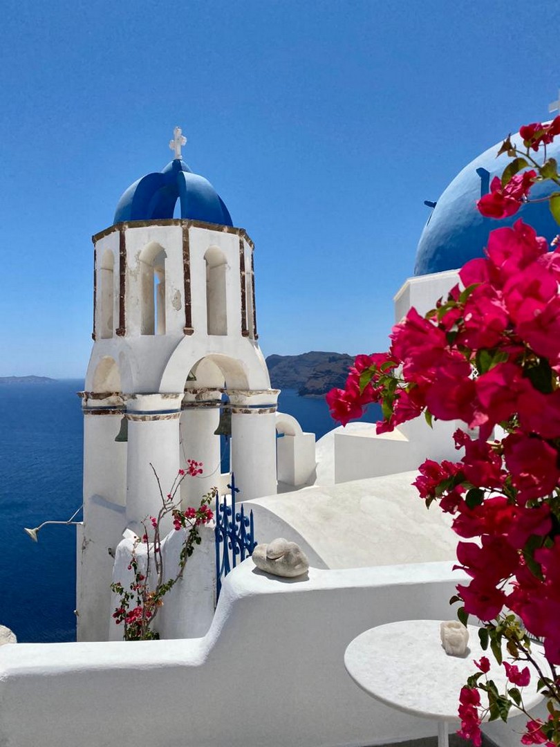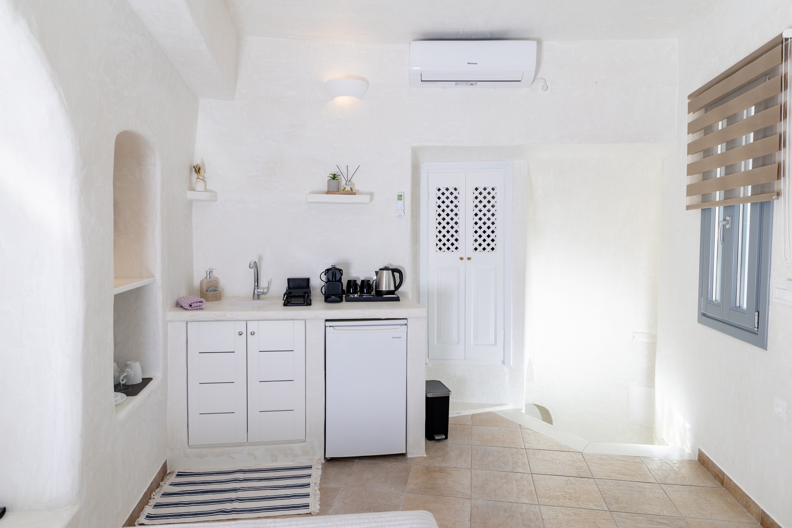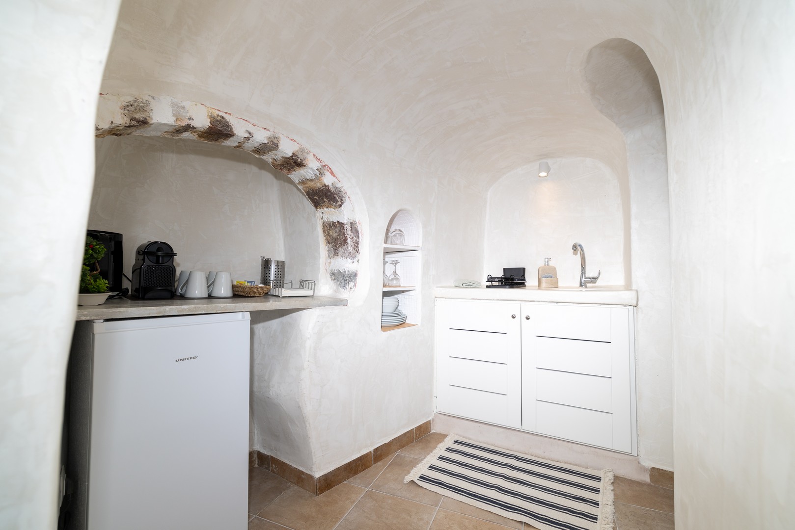 Santo Blue Horizon villa is found in the heart of Oia, at an exceptional location and has an amazing view. The three church domes exactly in front of the villa with the panoramic view have enchanted visitors and photographers from around the world, making it one of the most famous spots of Santorini. The property is in complete harmony with the natural environment of the area, and follows the rules of traditional Cycladic architecture. The villa is made up of two units. One is a traditional house-cave and one a studio, which combined can accommodate up to 7 people. The traditional house is 80sq.m., can accommodate 4 persons and has a private entrance, a big outdoor Jacuzzi for up to 4 persons, a spacious living room, a fully equipped kitchen and 2 bedrooms with a double bed and ensuite bathroom in each. The first bedroom has a large ensuite bathroom with Jacuzzi-hydromassage, while the second bedroom has an ensuite bathroom with shower. The "hot spot" of the traditional cave-house is a tunnel which leads to the upper level where there is a balcony and veranda with a magical view of the Aegean Sea, the Caldera, and is ideal for dinner and relaxation. The second unit of the Santo Blue Horizon villa, is a studio of 25sq.m., which has its own private entrance. It can accommodation up to 3 persons and features a bathroom with shower, a large double bed in a wooden loft and a spacious living room with a single bed. Both units are beautifully decorated and fully equipped. The traditional house-cave and the studio are only available for joint rental, not separately.