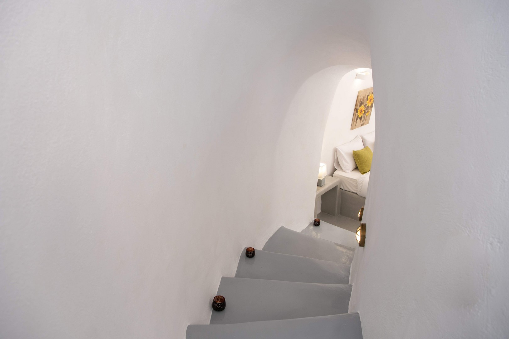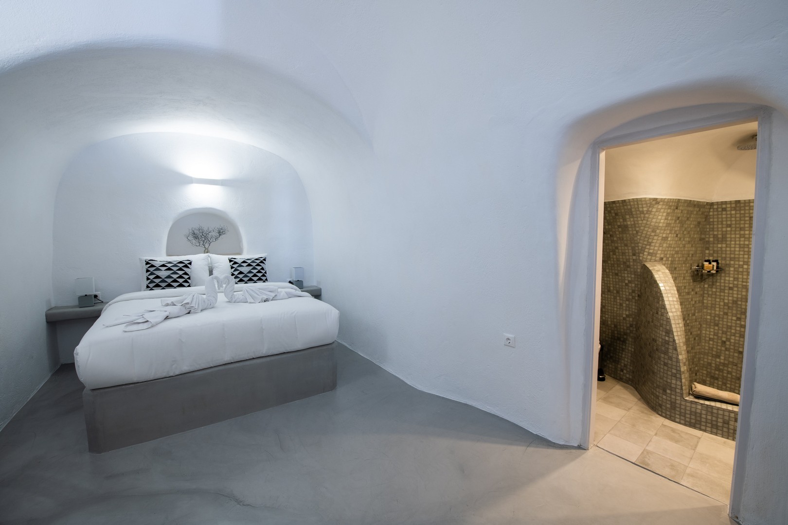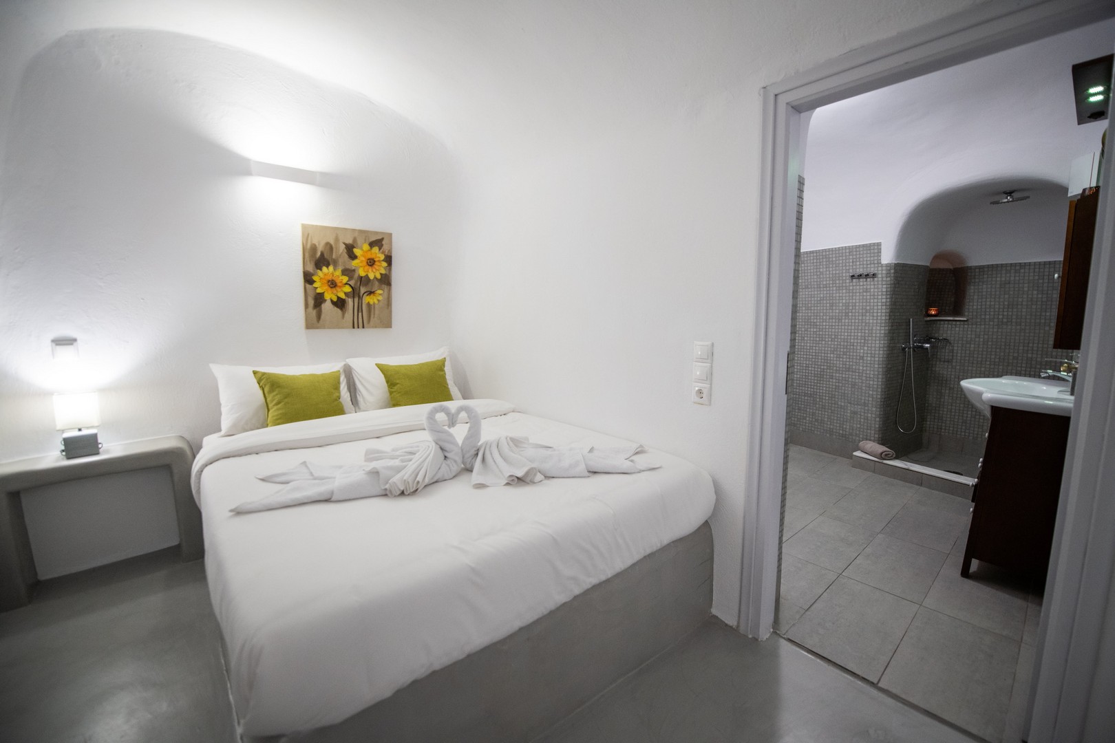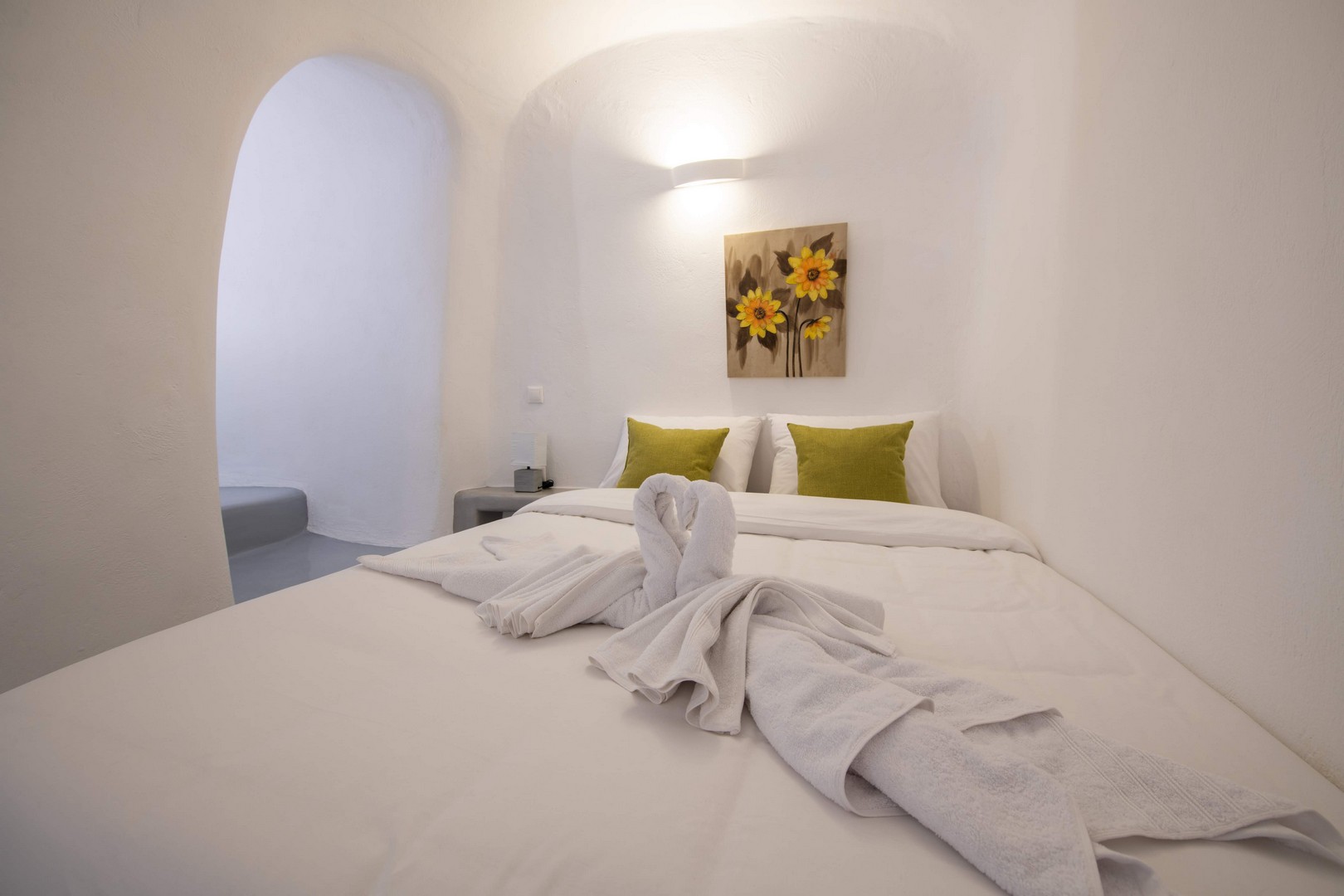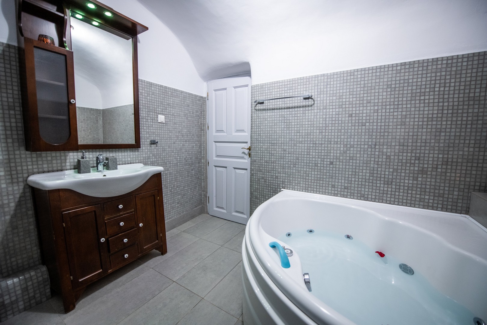 Santo Blue Horizon villa is found in the heart of Oia, at an exceptional location and has an amazing view. The three church domes exactly in front of the villa with the panoramic view have enchanted visitors and photographers from around the world, making it one of the most famous spots of Santorini. The property is in complete harmony with the natural environment of the area, and follows the rules of traditional Cycladic architecture. The villa is made up of two units. One is a traditional house-cave and one a studio, which combined can accommodate up to 7 people. The traditional house is 80sq.m., can accommodate 4 persons and has a private entrance, a big outdoor Jacuzzi for up to 4 persons, a spacious living room, a fully equipped kitchen and 2 bedrooms with a double bed and ensuite bathroom in each. The first bedroom has a large ensuite bathroom with Jacuzzi-hydromassage, while the second bedroom has an ensuite bathroom with shower. The "hot spot" of the traditional cave-house is a tunnel which leads to the upper level where there is a balcony and veranda with a magical view of the Aegean Sea, the Caldera, and is ideal for dinner and relaxation. The second unit of the Santo Blue Horizon villa, is a studio of 25sq.m., which has its own private entrance. It can accommodation up to 3 persons and features a bathroom with shower, a large double bed in a wooden loft and a spacious living room with a single bed. Both units are beautifully decorated and fully equipped. The traditional house-cave and the studio are only available for joint rental, not separately.